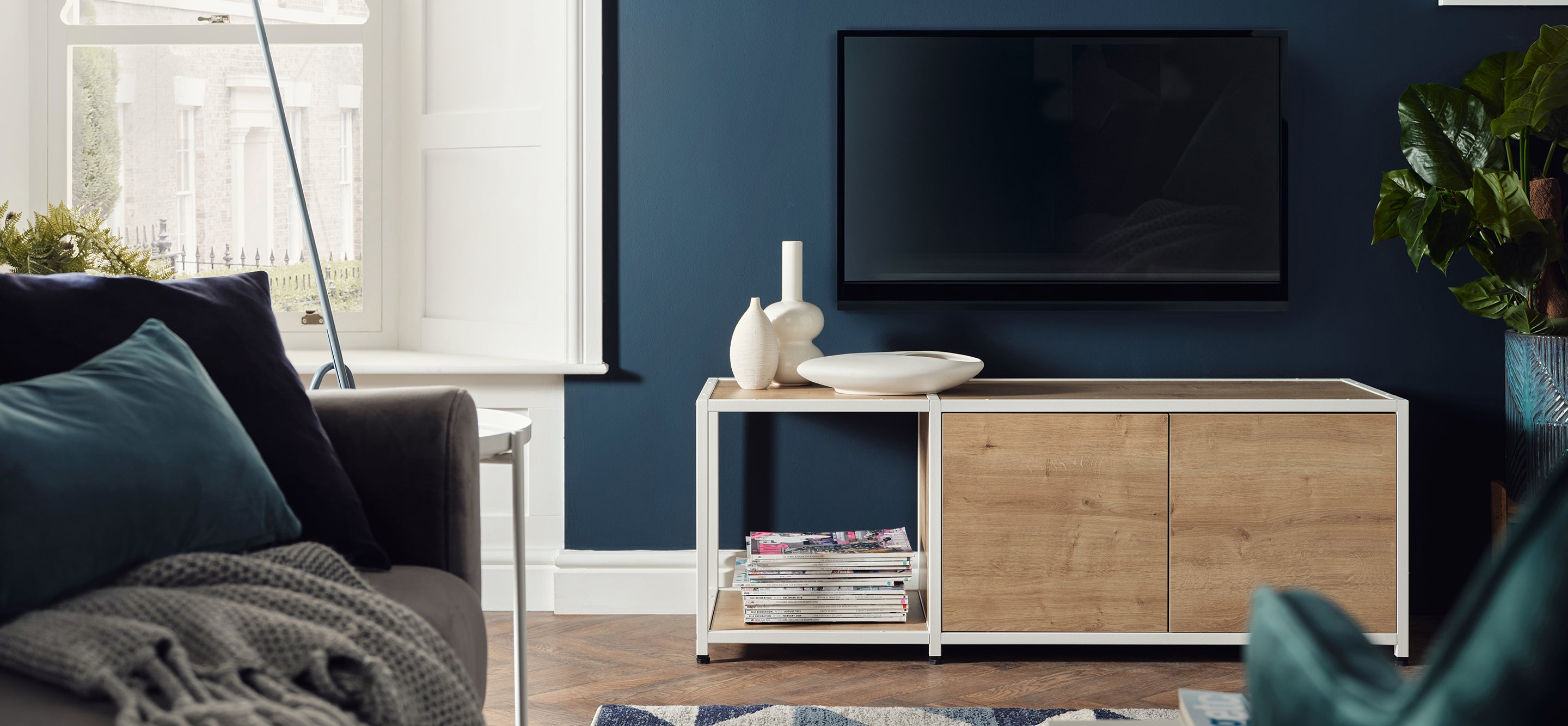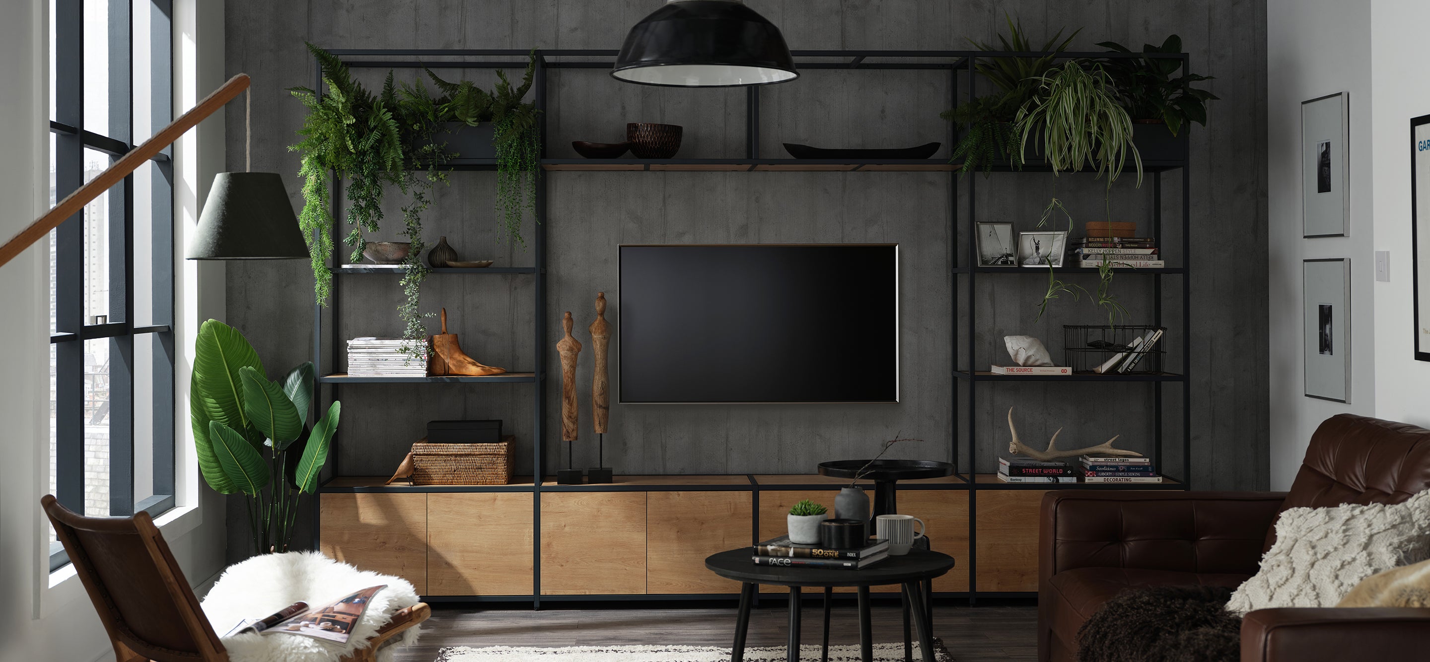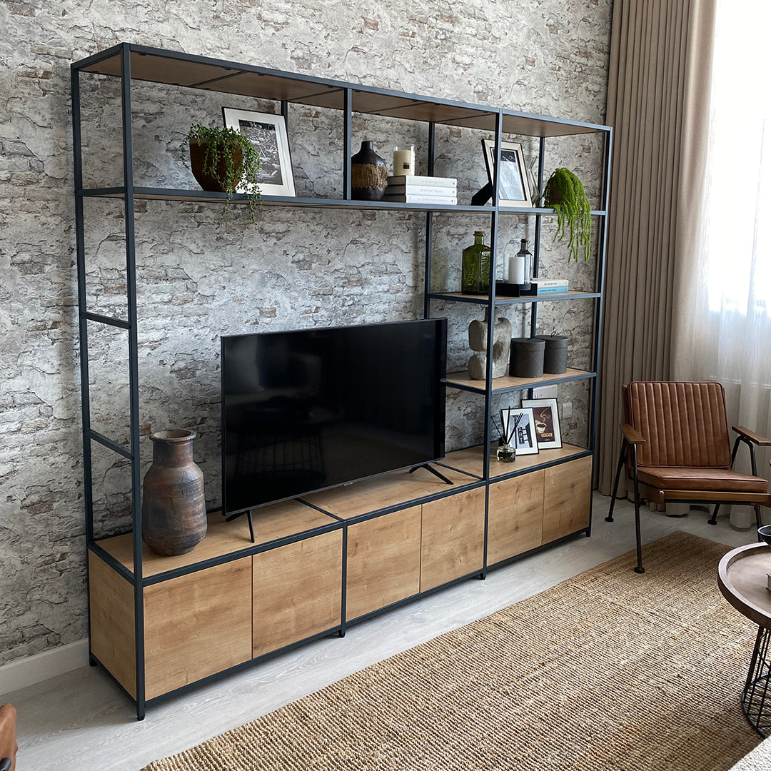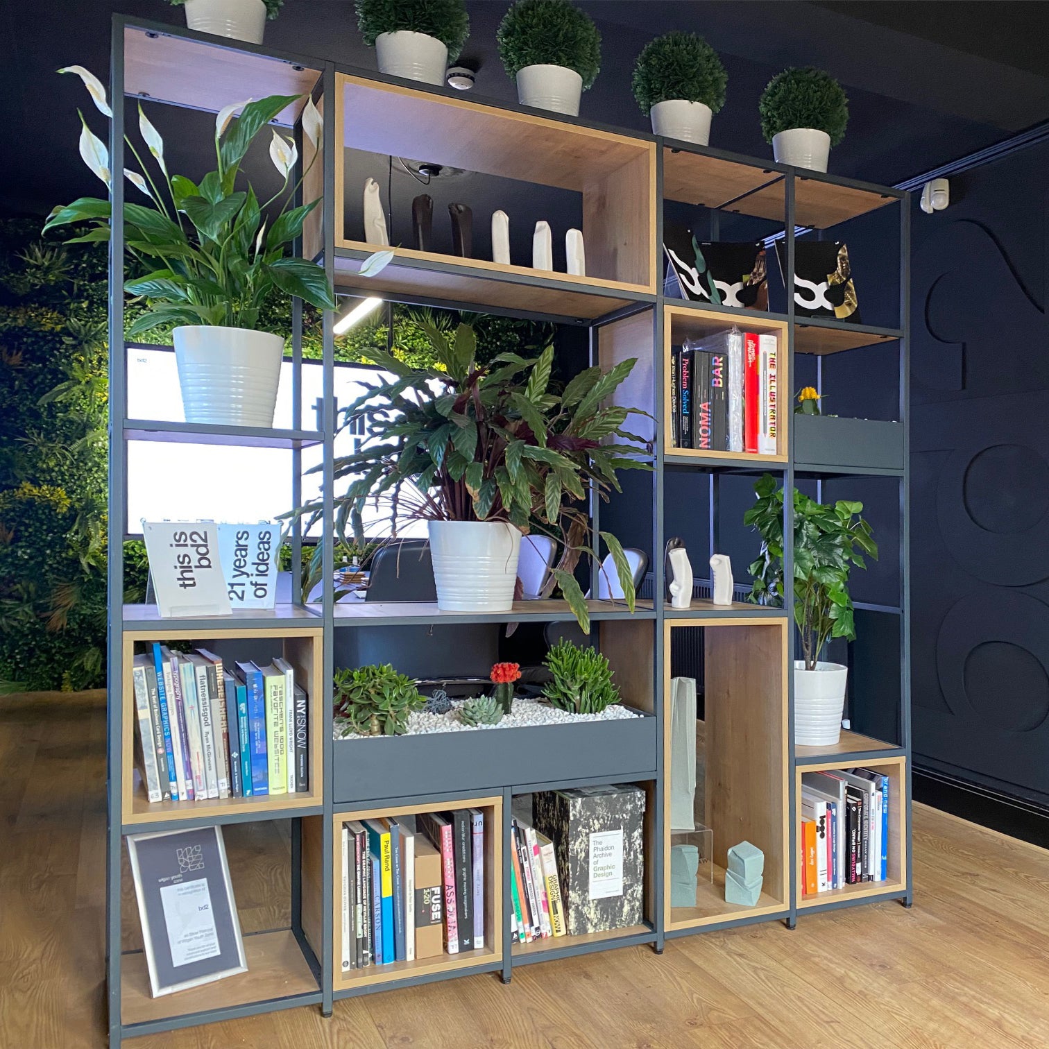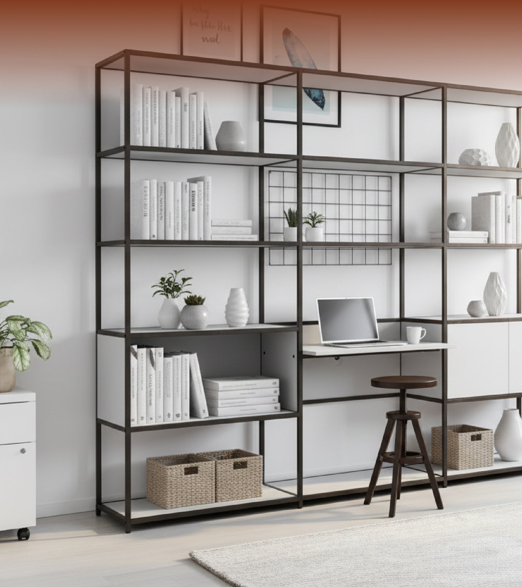Shelved is a modular furniture system designed by you, and made by us. Whether you’re looking to add or change the décor of your space, or find something that fits your existing aesthetics, our system gives you the option to get the look you really want. The Shelved steel framework is available in crisp White, contemporary Anthracite, and that sought-after industrial Clear Coat. With Graphite, White, or Oak panel finishes, you can mix and match your system’s colours to create the perfect combination for your own
