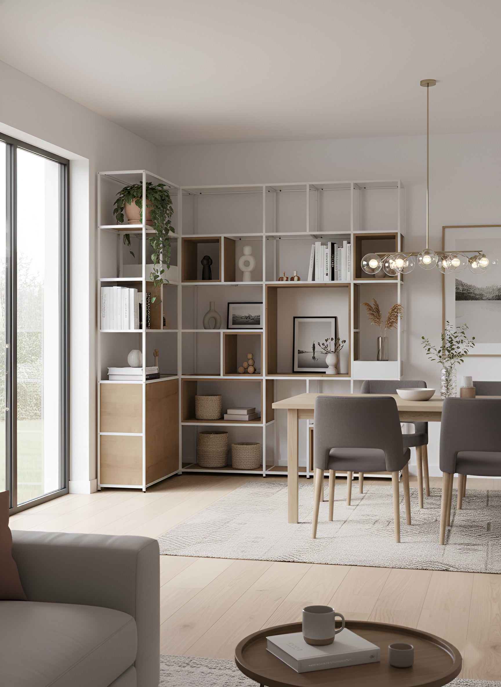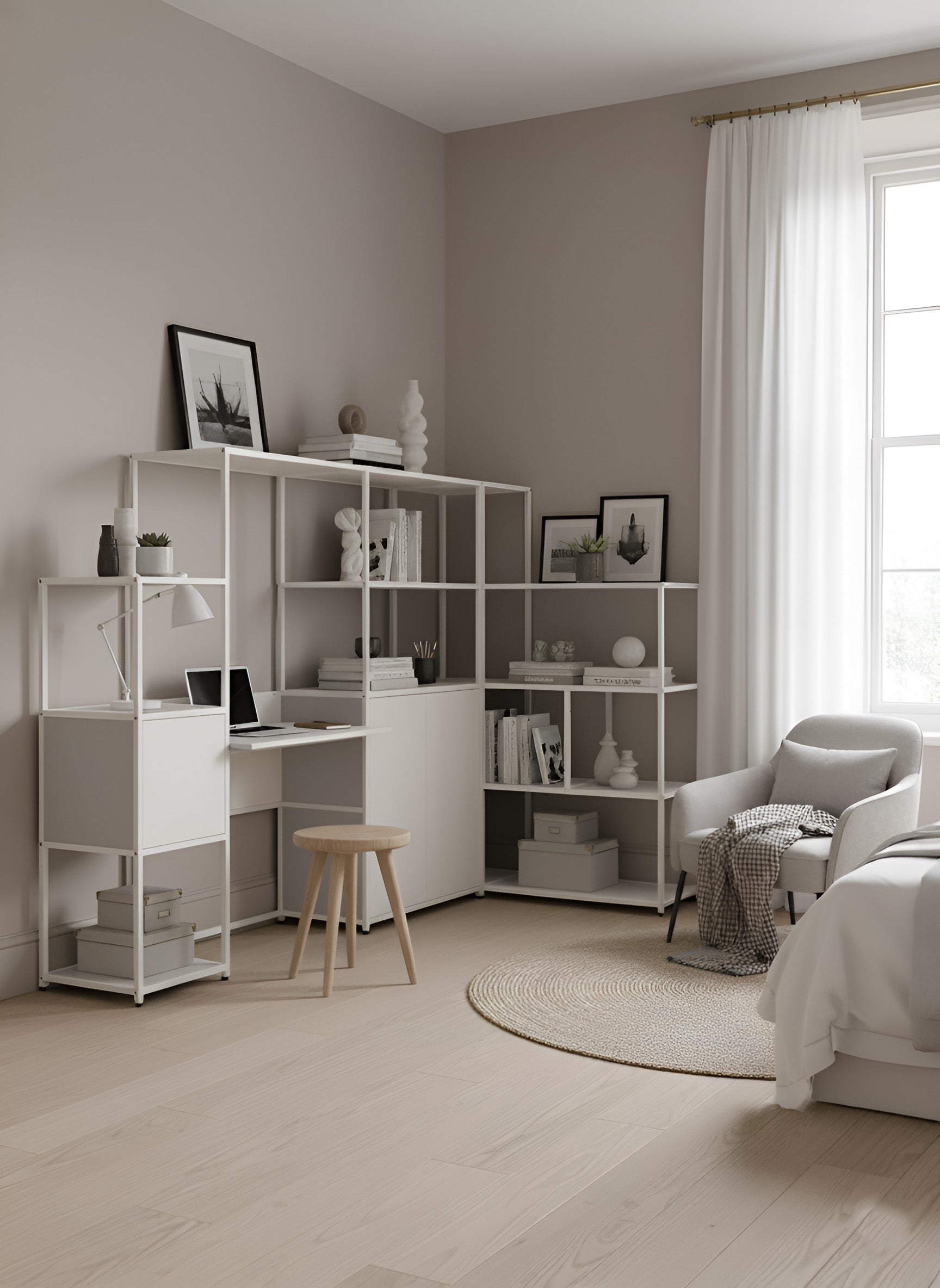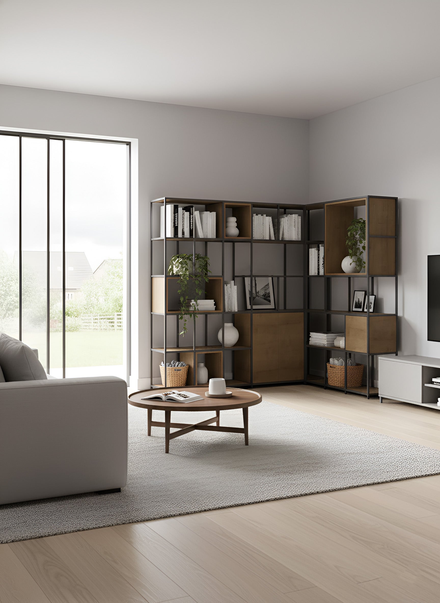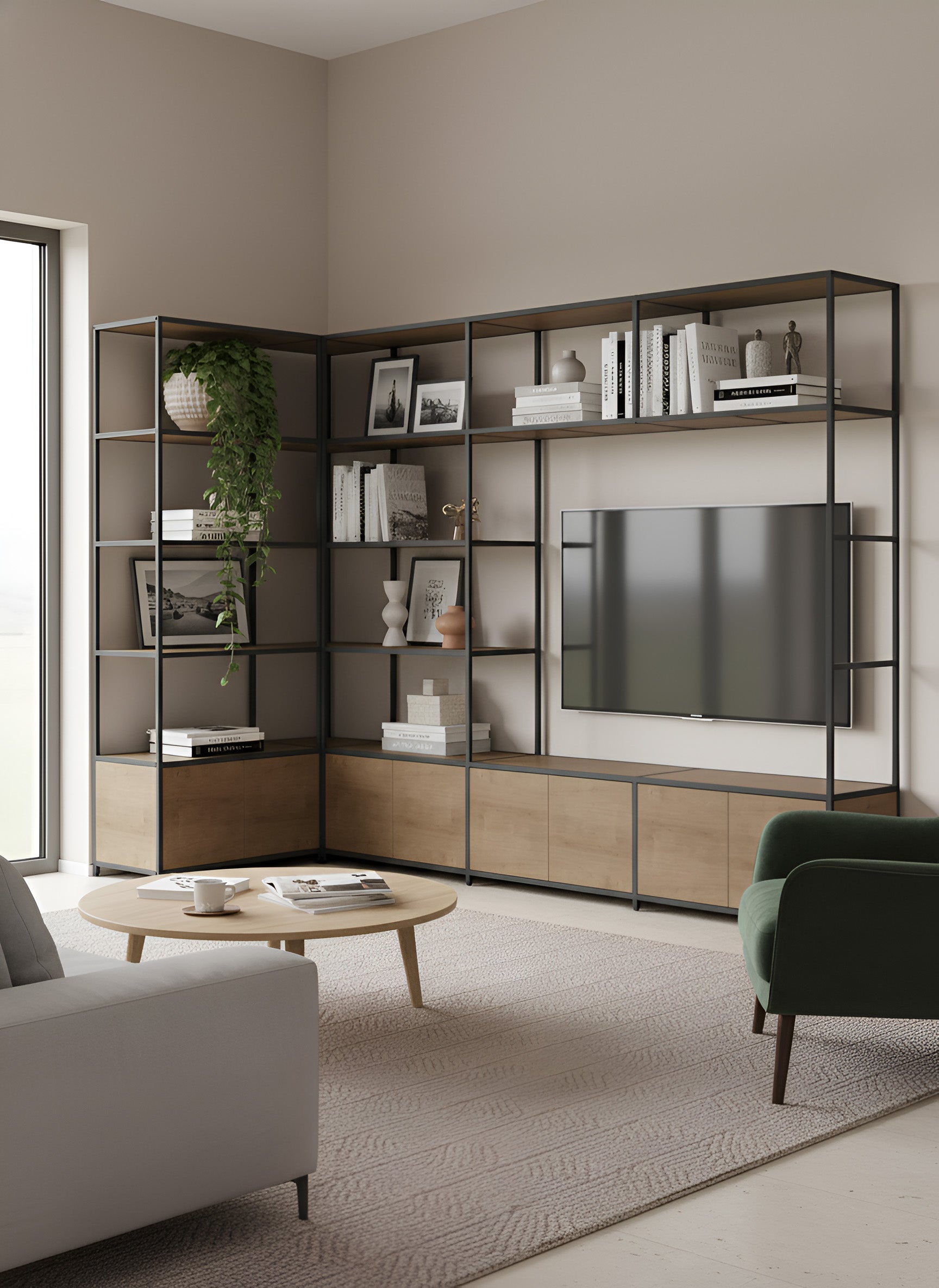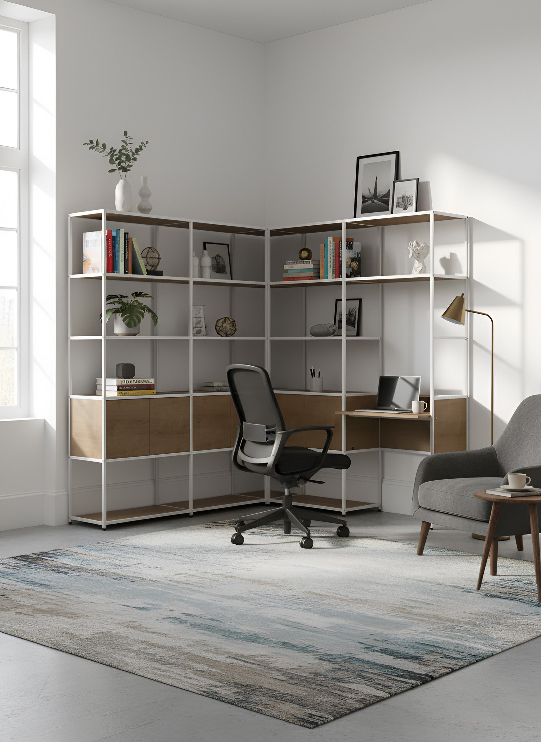 Whether you’re looking for open shelves to display your favourite books and ornaments, storage cupboards to keep clutter tucked away, or even a built-in corner desk for your home office, this versatile collection has you covered. Crafted from a durable metal grid framework, these corner units deliver both strength and modern elegance, blending seamlessly into any interior style.