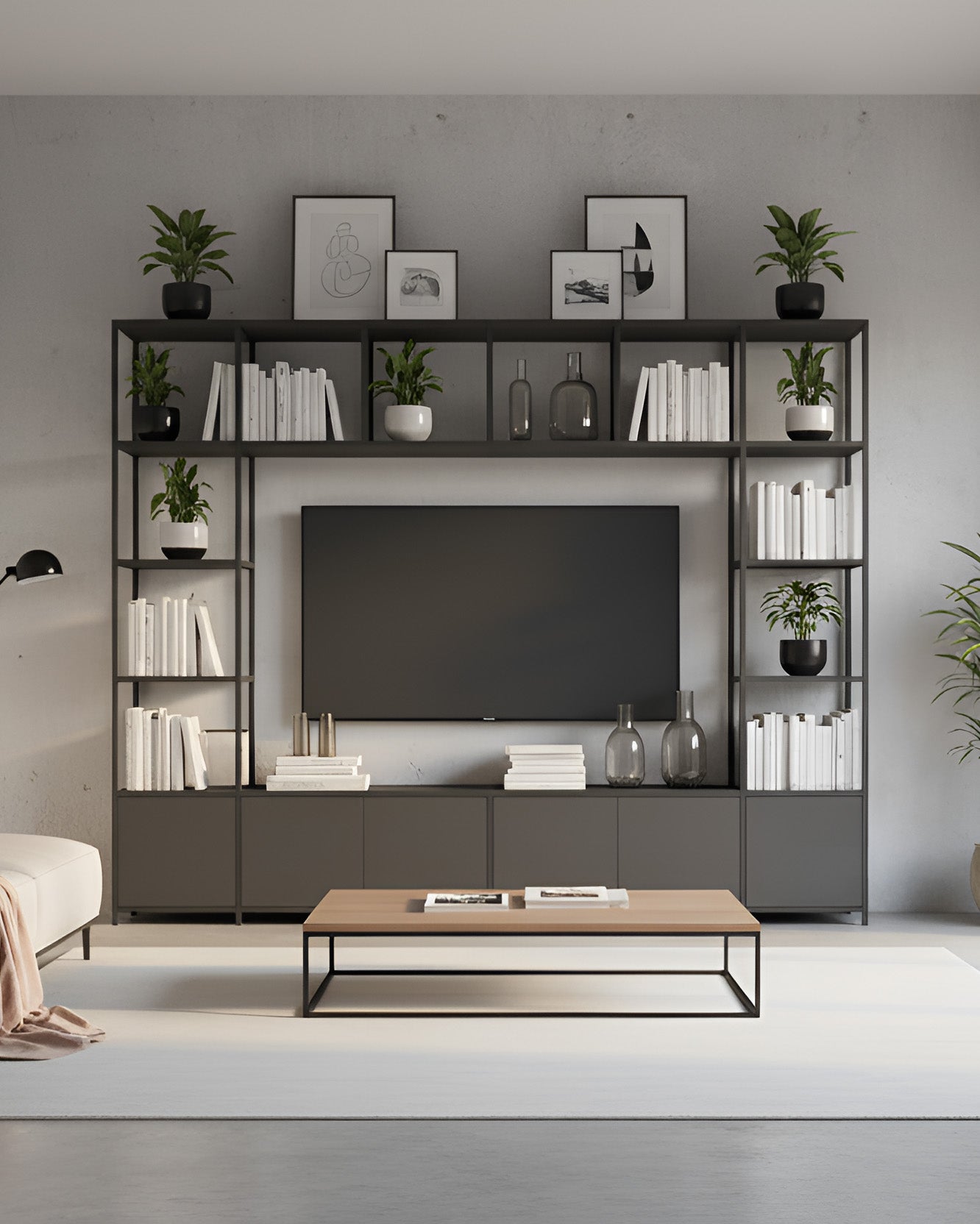 Our modular TV units let you build a bespoke display and storage system based entirely on your space and needs. The contemporary metal grid structure will frame your TV to perfection whilst giving you the ability to add shelves, cupboards, and more for storing accessories and ancillary devices.