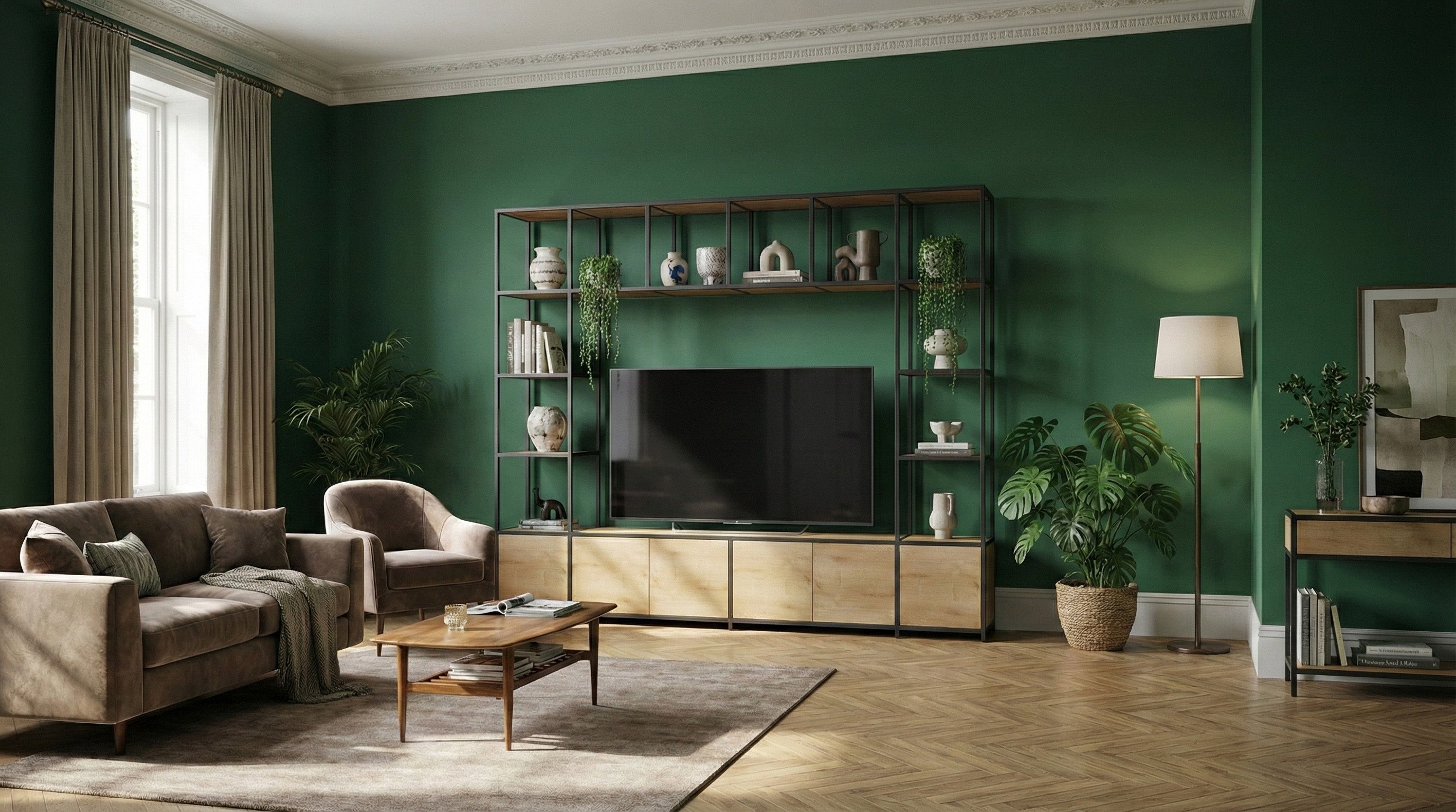 Our free 3D configurator lets you build modular TV units in minutes. Set the overall width and height, choose a space to suit your TV, then mix open shelves, cupboards for consoles, set-top boxes and soundbars. Add cable management in cupboards and be sure to include ventilation space for amps and other electricals. Preview finishes, trims and live dimensions and pricing as you go.