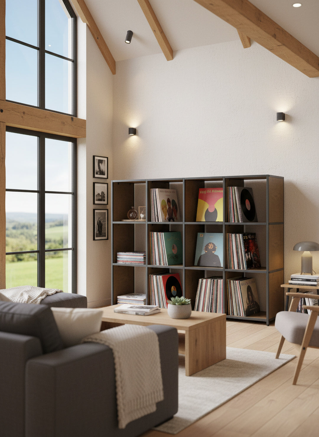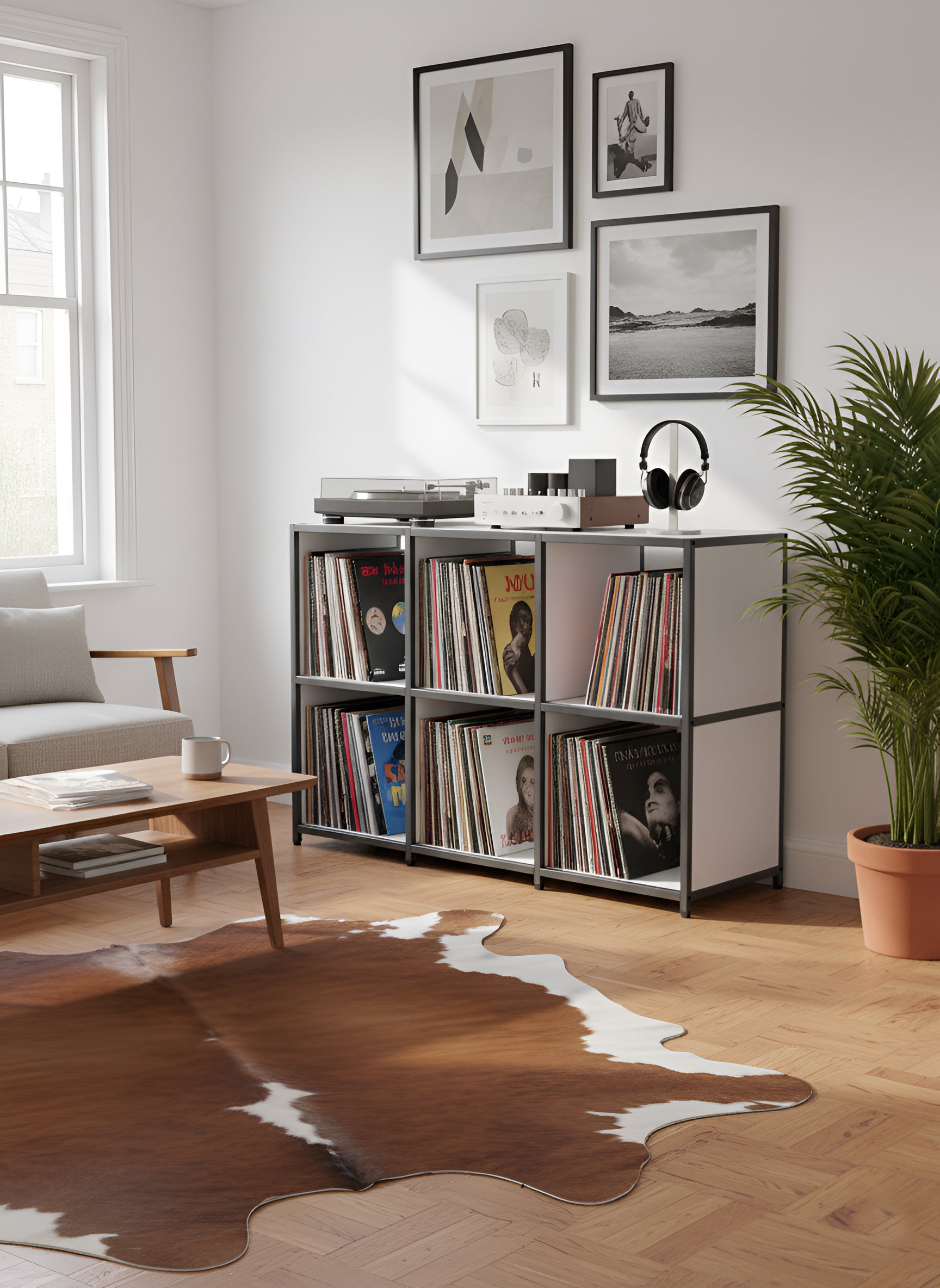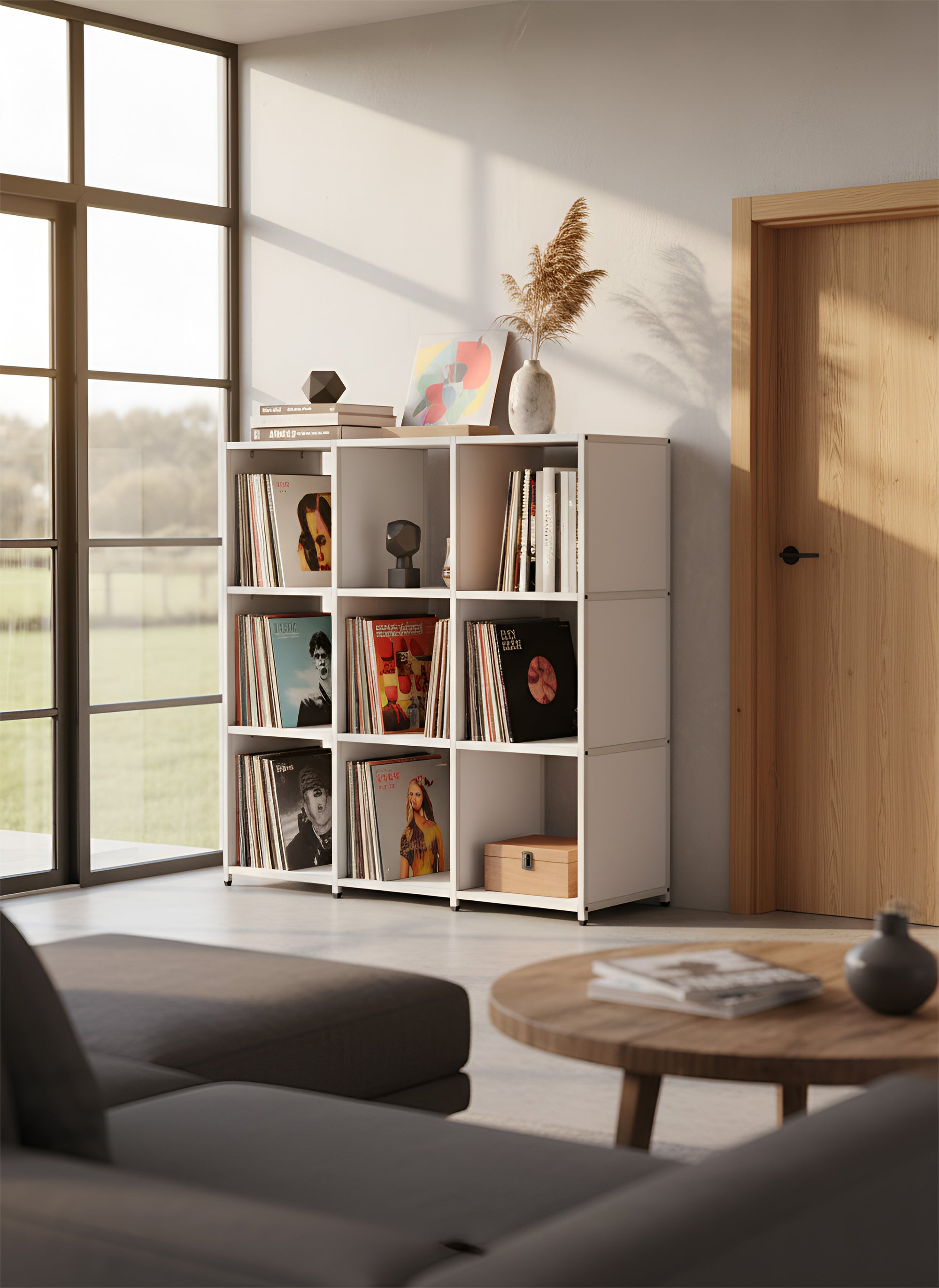 Our free 3D configurator lets you build a modular vinyl unit in minutes, made specifically for record collection. Pick record cubes (40 cm) that hold ~100 LPs each (max 20 kg), stack and span them to fit your space, and add extras like a turntable/amp bay or display shelves. You’ll see live dimensions, finishes, and pricing as you go, so you know exactly what you’re getting before you order.