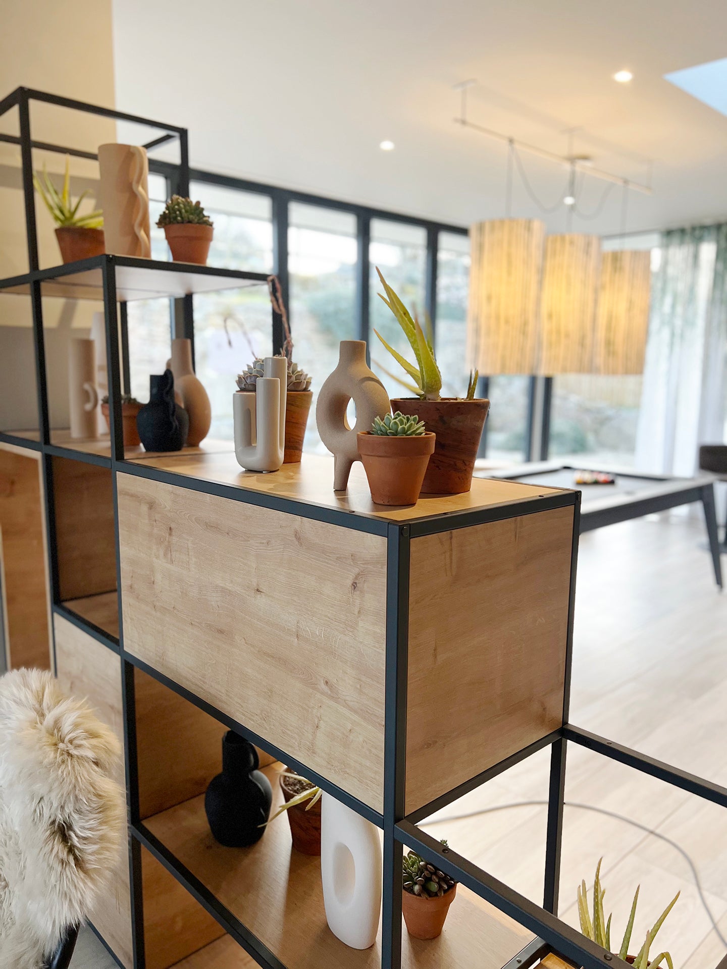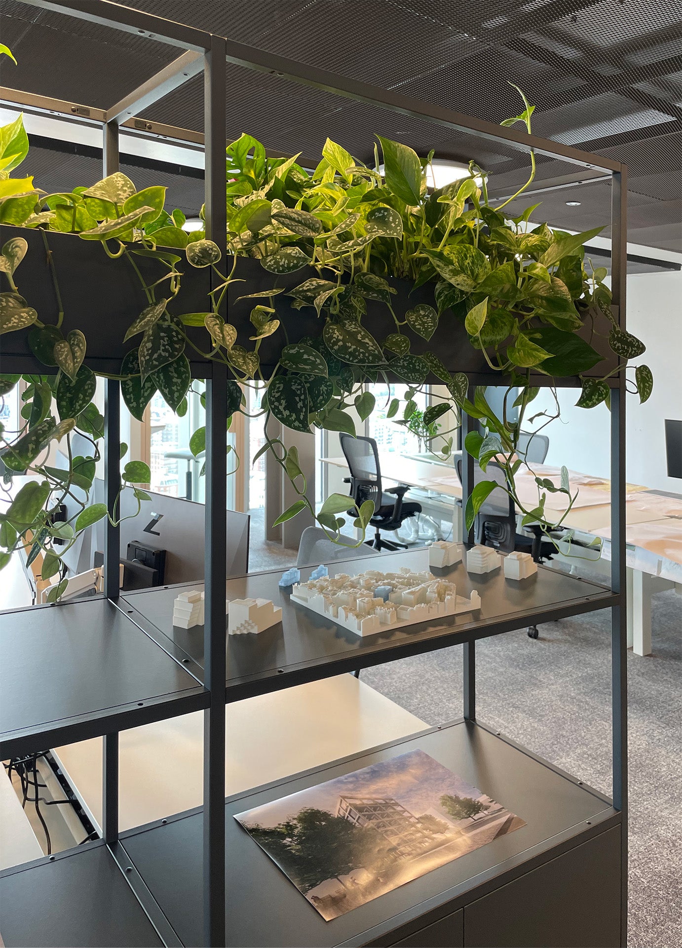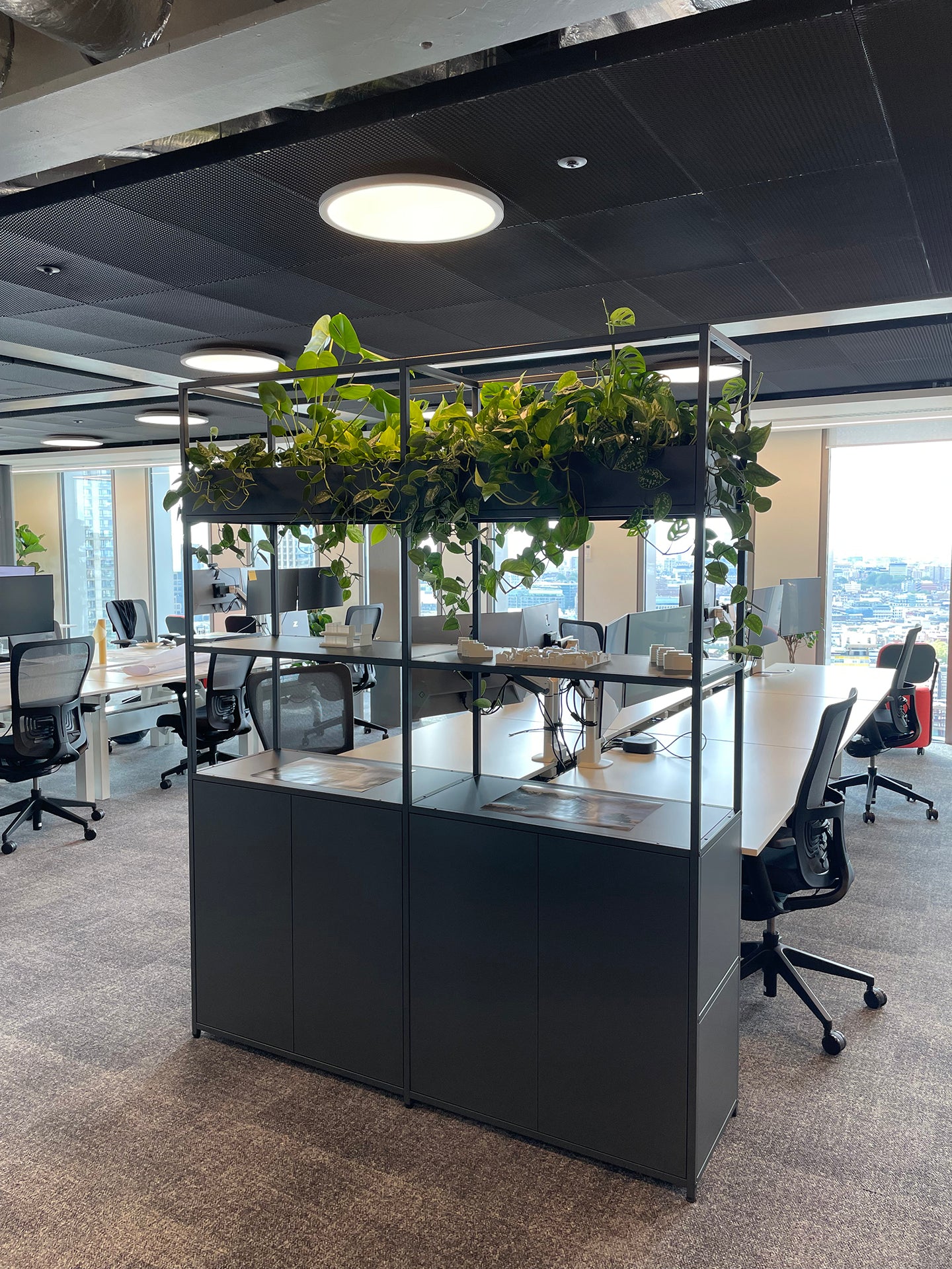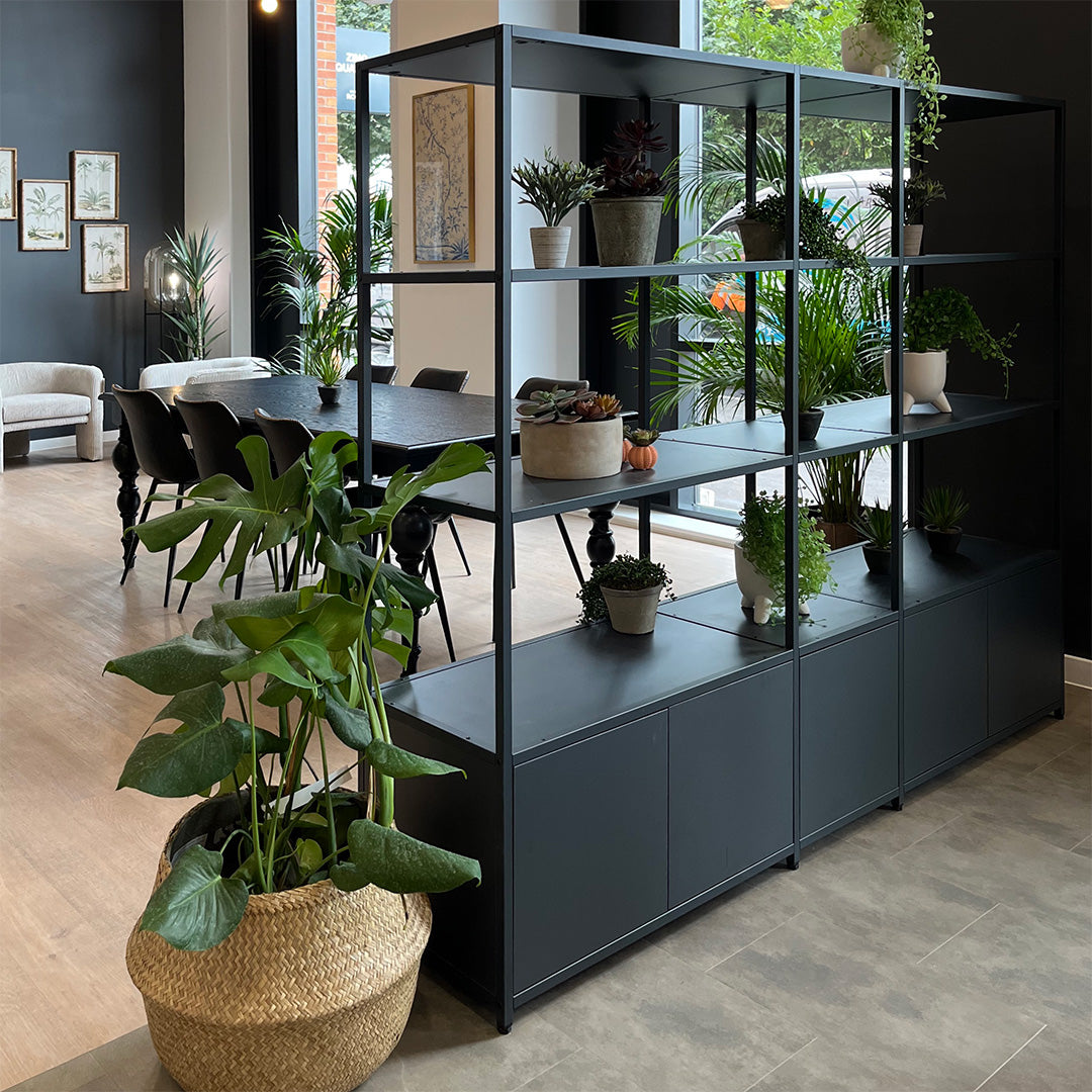 The Shelved modular storage system was originally conceived as a commercial office storage solution. With the evolving landscape of commercial offices, furniture needs to be more adaptable, customisable and flexible than ever before. Our grid shelving system works perfectly as a room divider, offering clear delineation of space whilst minimising the disruption to light levels thanks to its slender steel framework. With the addition of planter boxes, fabric panels and wooden storage accessories, Shelved storage units can be designed to suit any scheme.