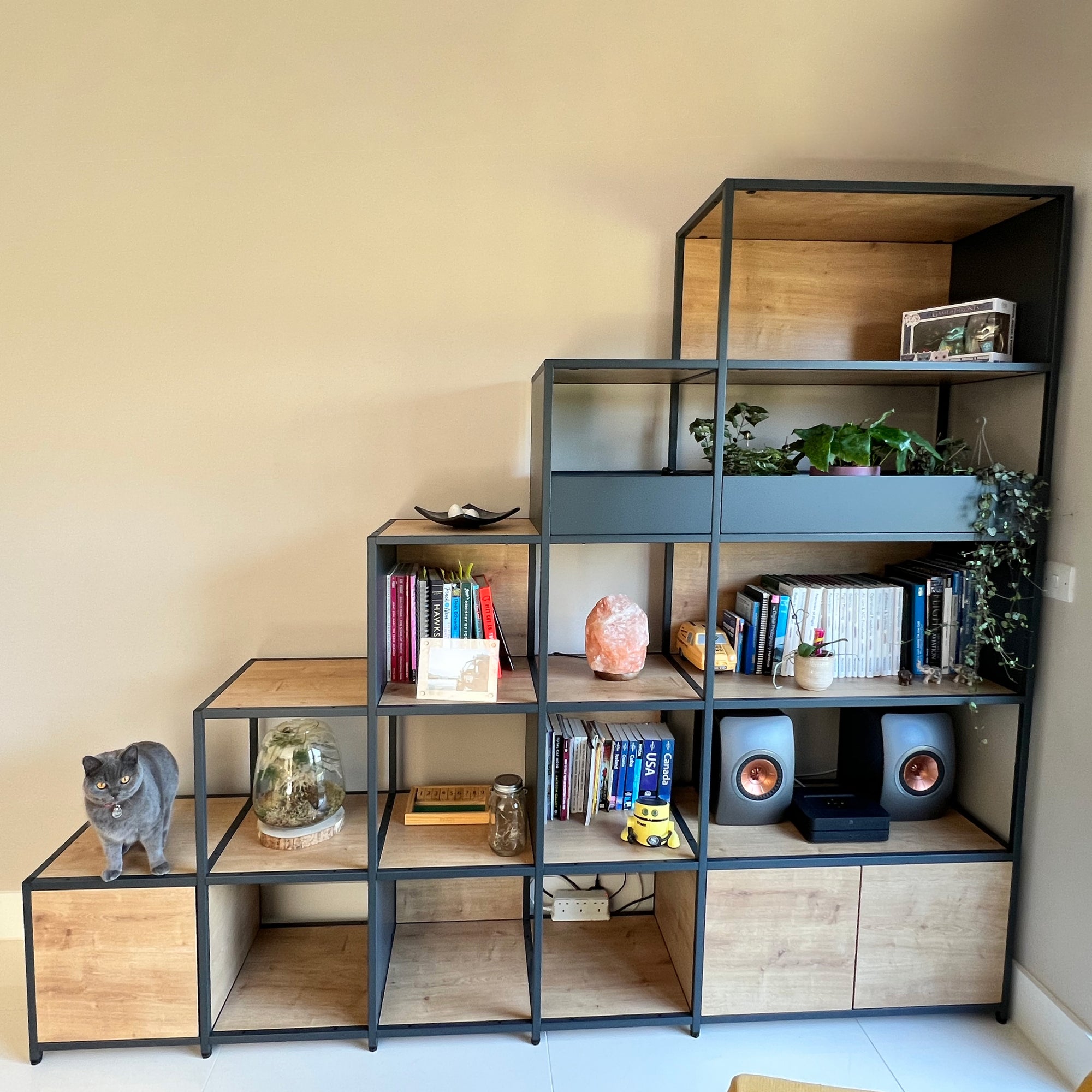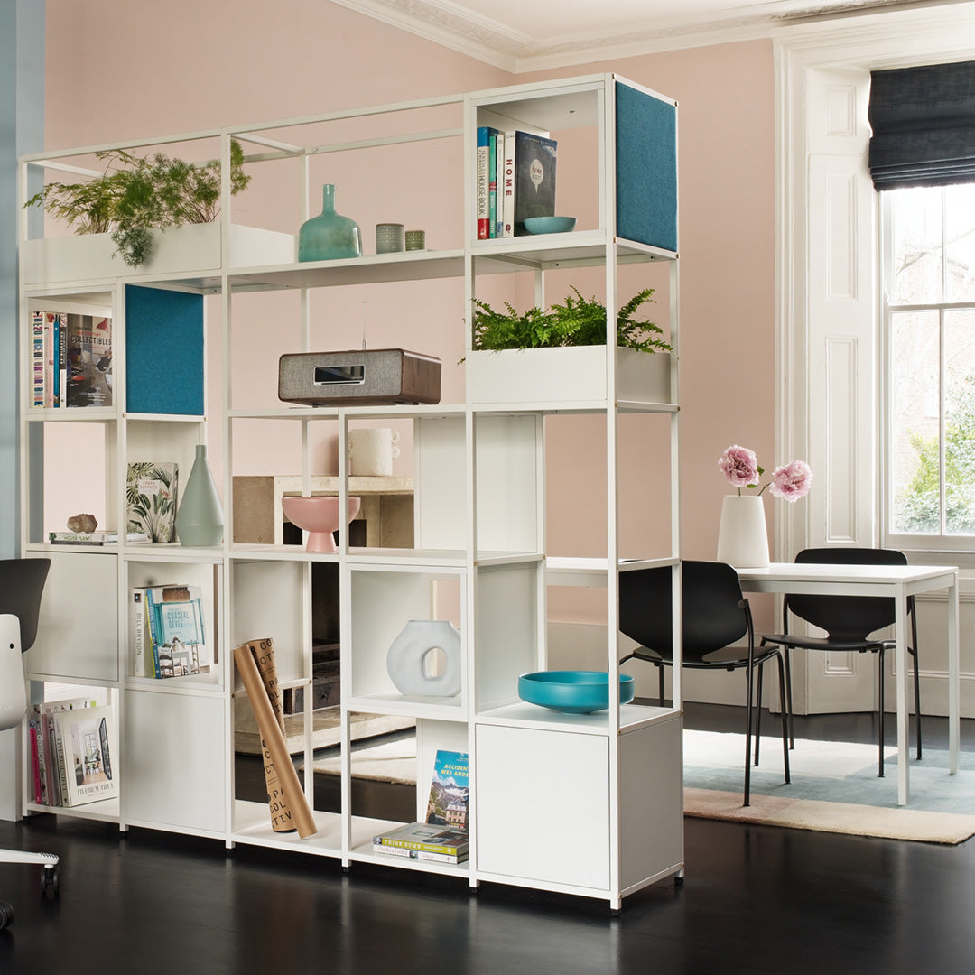 The Baysdale Modular Feature Shelving Unit uses our proprietary metal framework and boasts nine open fixed shelves, two single cupboards (each with an adjustable shelf and rear cable access), and a planter box with a waterproof liner. You can customise the Baysdale by choosing your frame and panel colour combinations above, or personalize it to your exact tastes in our 3D configurator.
